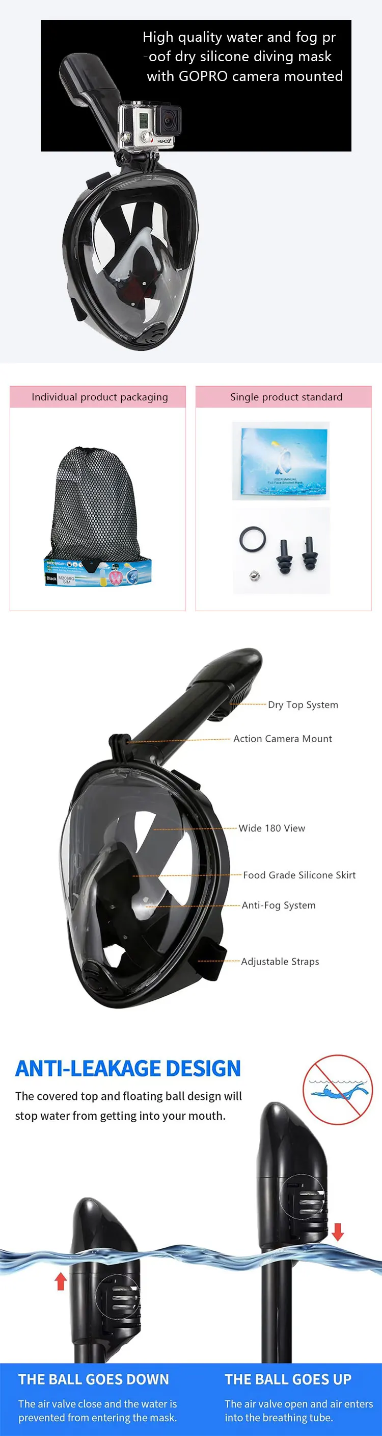The first generation of high quality water and fog resistant all-dry silicone diving masks can be fitted with GOPRO cameras